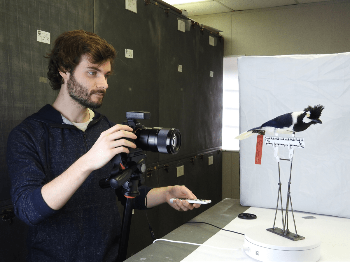 Medina uses a 3D technique called photogrammetry. His initial setup as an undergraduate was in his dorm, using a turntable with a stuffed bird specimen and a number of desk lamps. (“People walking in must have thought it looked very eerie.”) Manually “DJing” the table, he would take hundreds of digital photos from various angles as the bird rotated. He’s since ditched the DJing and the dorm room, and transitioned into a fully automated turntable that spins the bird with every click of the camera. A single model can comprise of up to 288 photos from three different angles, processed by home-brewed open-source programs.
