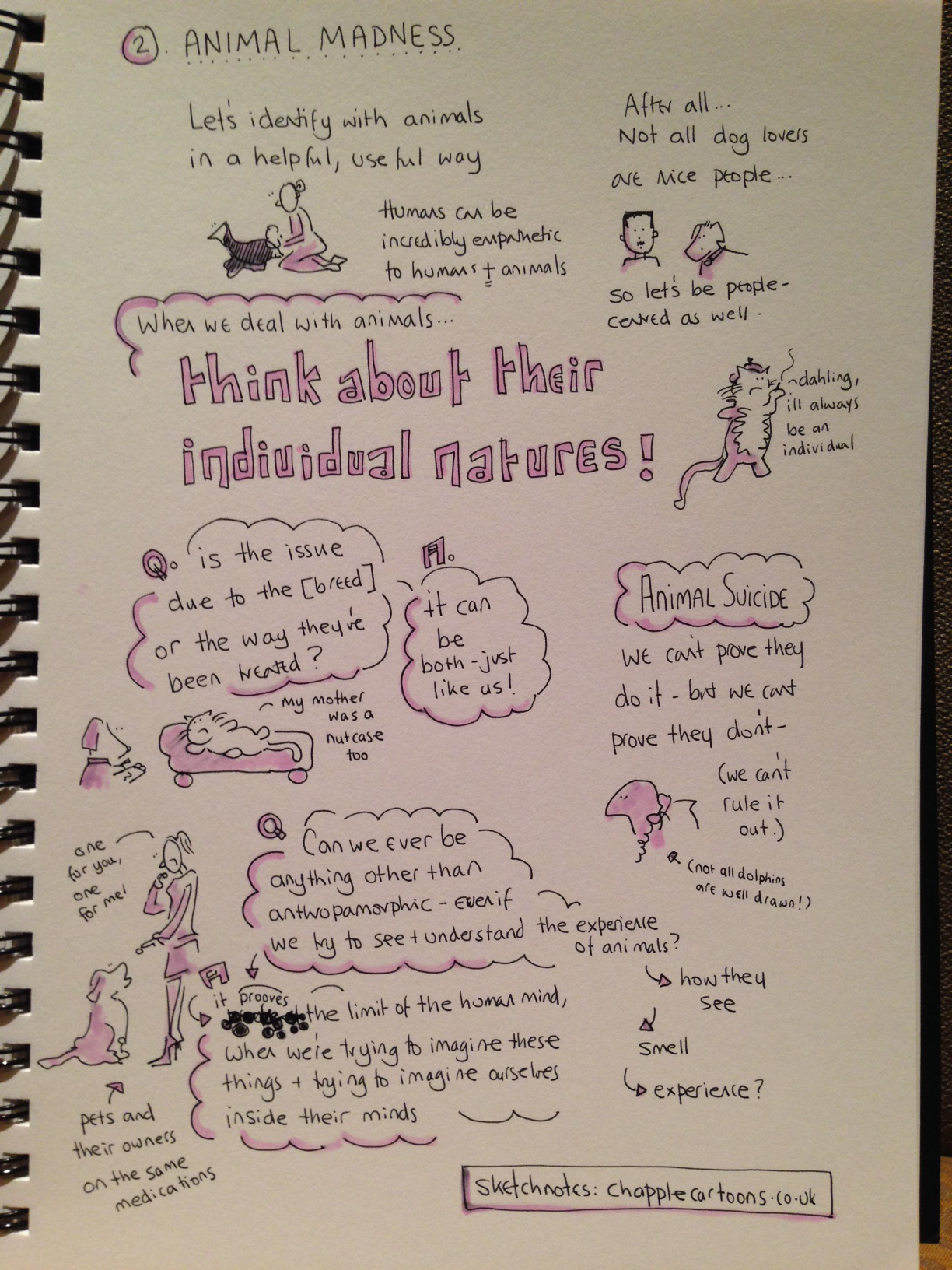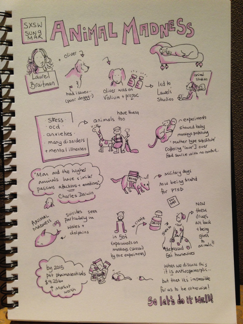 Animal Madness (Sunday, March 9, 2014) A range of animals can suffer from various mental illnesses. In the case of our pets, we often treat them with drugs akin to the ones we use to treat ourselves. By 2015, the U.S. market for pet pharmaceuticals is projected to be $9.25 billion, said Laurel Braitman, the author of Animal Madness and a speaker at a session by the same name—and that doesn’t include the drugs we pick up from regular pharmacies instead of the vet. Below is cartoonist and session attendee Caroline Chapple’s creative take on the session.