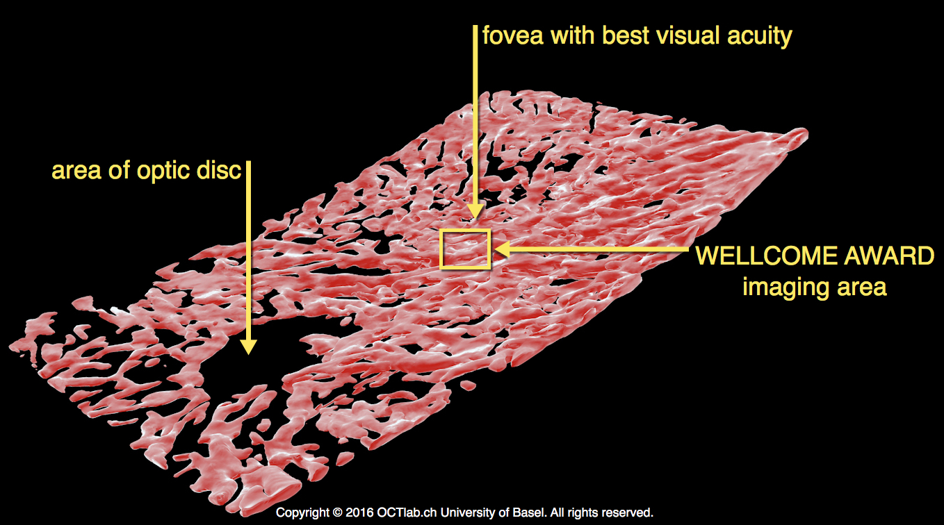 The award-winning image “looks like a cave, because normally you have blood cells inside that space, but the blood cells move so fast that you actually can’t image them,” Maloca says. “The space is empty because we can’t track them with the laser scanner.”