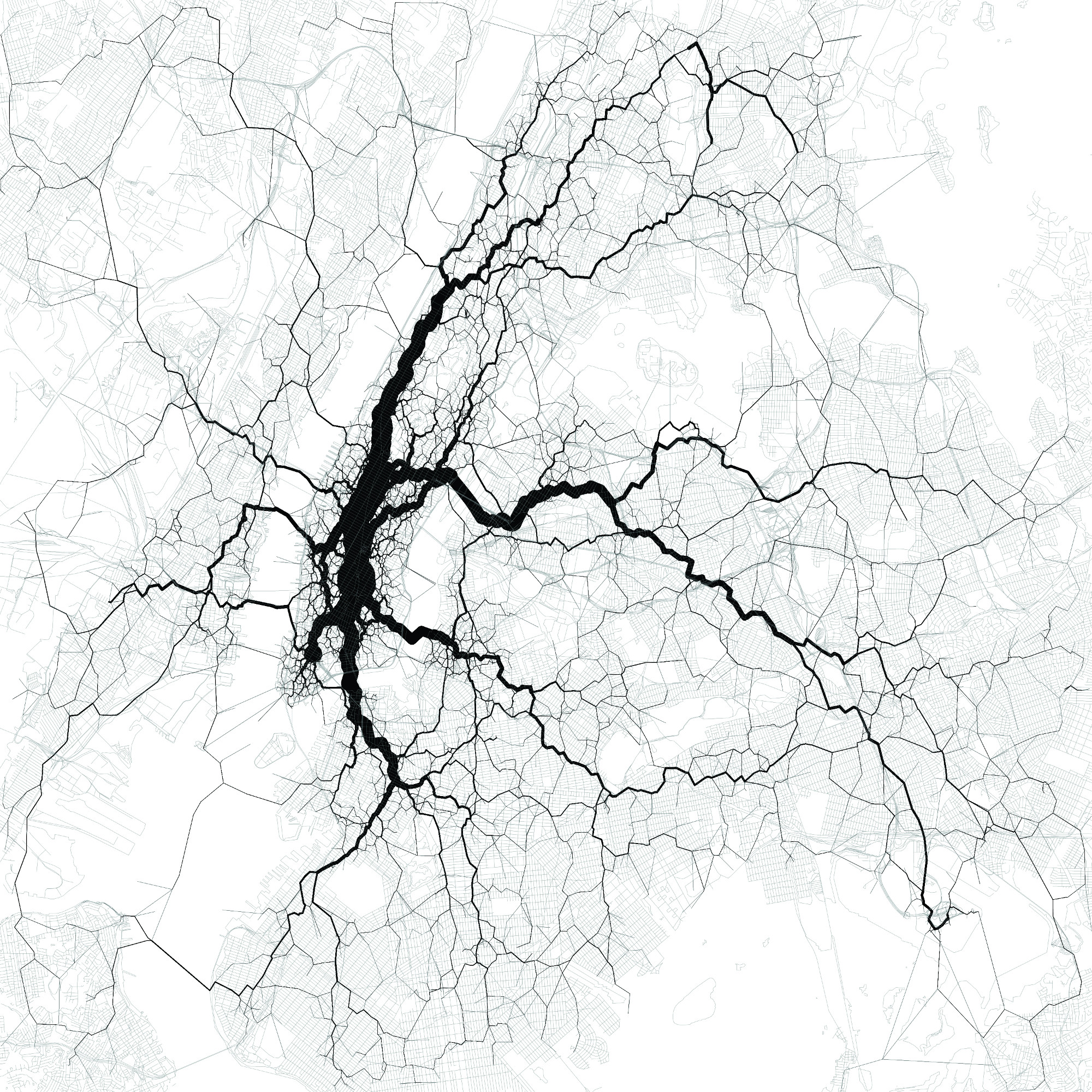 The vein-like threads in Eric Fischer’s map pulse with information conveyed through people’s tweets on Twitter, which is “the largest and most demographically representative source of public real time mobility data I know of, with over four million worldwide geotagged tweets a day,” says Fischer. He says this type of map could inform decisions on how to enhance subway systems by prompting questions such as, “‘What routes will satisfy the largest transportation needs and simultaneously bring those riders past the greatest number of intermediate destinations along the way?’ New York already has most of the subways it needs, but many other cities don’t.”