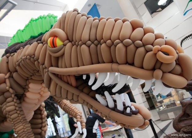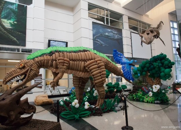 Your eyes aren’t deceiving you—the dinosaur in the image above is made entirely out of balloons. It’s an Acrocanthosaurus, to be exact, fashioned for the Virginia Museum of Natural History by Airigami, a company that specializes in a singular kind of balloon art. Measuring about 20 feet long, the sculpture is life-size—indeed, it mimics an intact Acrocanthosaurus skeleton cast housed at the museum.