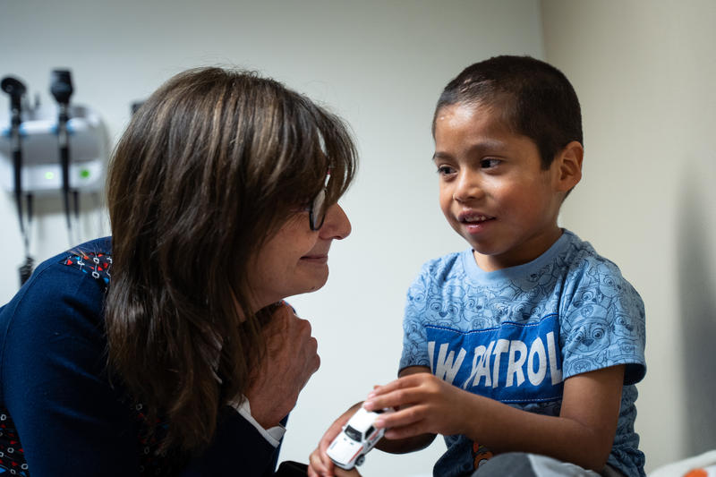 A tiny boy in Batman socks and a Paw Patrol T-shirt, Abraham is smiley and sweet but painfully shy. During his stay in the hospital, he’d jump out at doctors from behind his curtains, and a video from his birthday shows him hopping from foot to foot while handing out cupcakes to staff. Today, however, pediatric dietitian Danielle Mein can barely get one word out of him at a time.