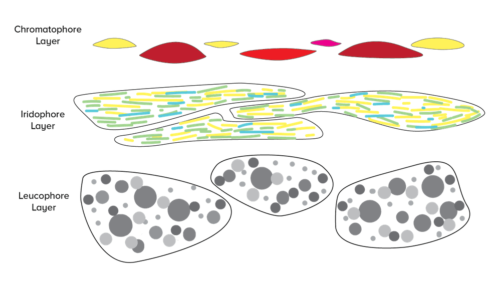 Severus Snape once told Harry Potter, in Harry Potter and the Order of the Phoenix: “The mind is a complex and many-layered thing.” The same might be said of cephalopod skin. Well, it may not have as many layers as your mind, but it does have at least three distinct layers. Going from the outside in, we find a chromatophore layer, an iridophore layer, and a leucophore layer. The chromatophore layer uses spots of pigment to paint patterns; the iridophore layer bends and bounces light to display shimmering colors; the leucophore layer serves as a reflective background for everything above it. Each layer of cephalopod skin contributes its own little bit of artistry to the overall painting.
