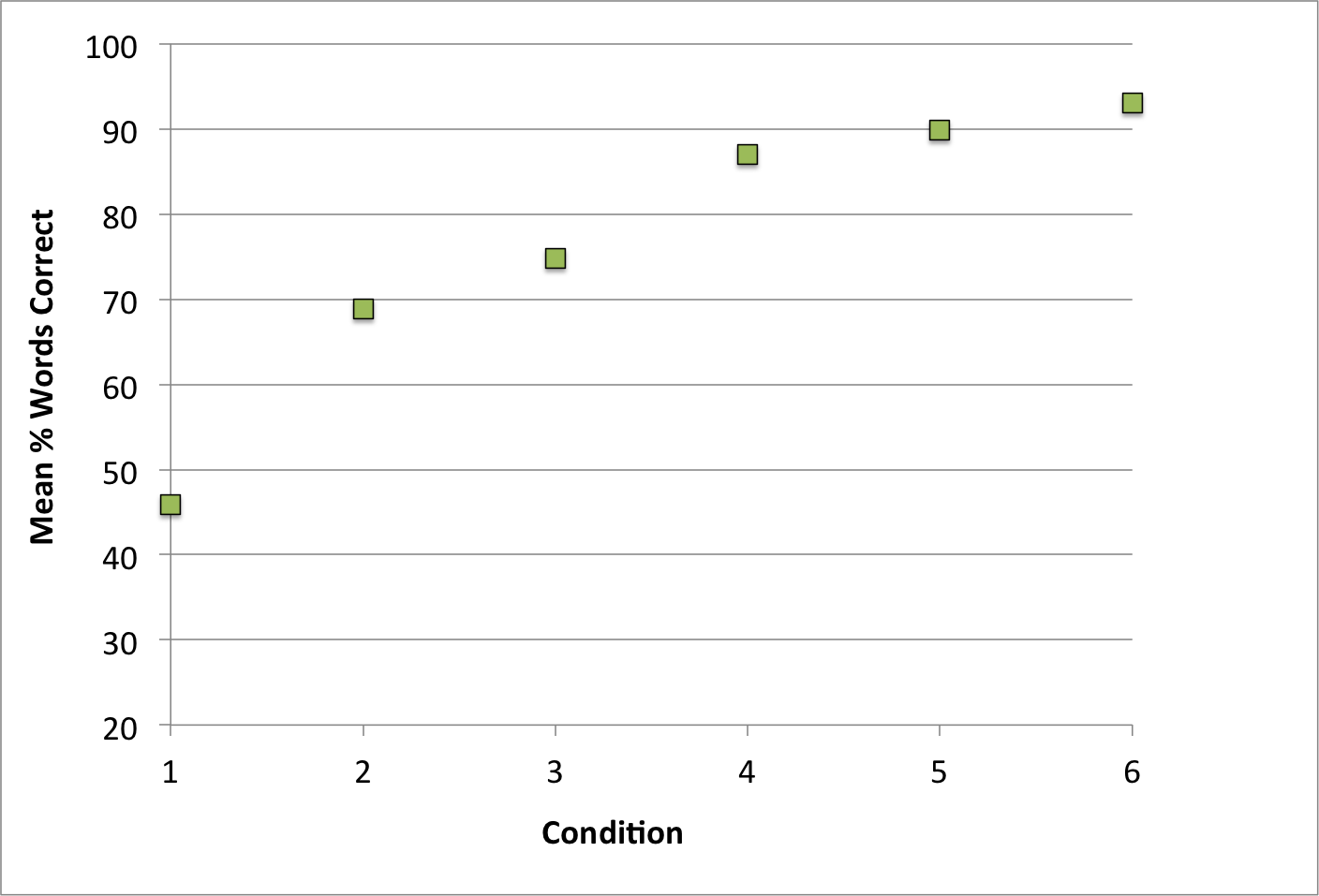 - Look at the results from the study above: Which condition resulted in the highest percentage of words correct? Which condition resulted in the lowest score?