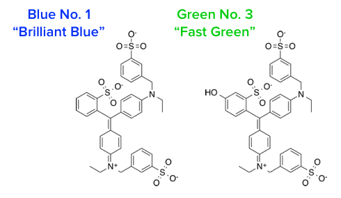 It starts with how we color foods. Synthetic dyes, like food coloring, use organic molecules. When white light hits a molecule’s electrons, some wavelengths of light (colors) are absorbed, while others are reflected. Whatever color of light gets reflected is what we see. Subtle differences in molecular structure will drastically change a dye’s color. Check out the diagram below to see how this light absorption and reflection works.
