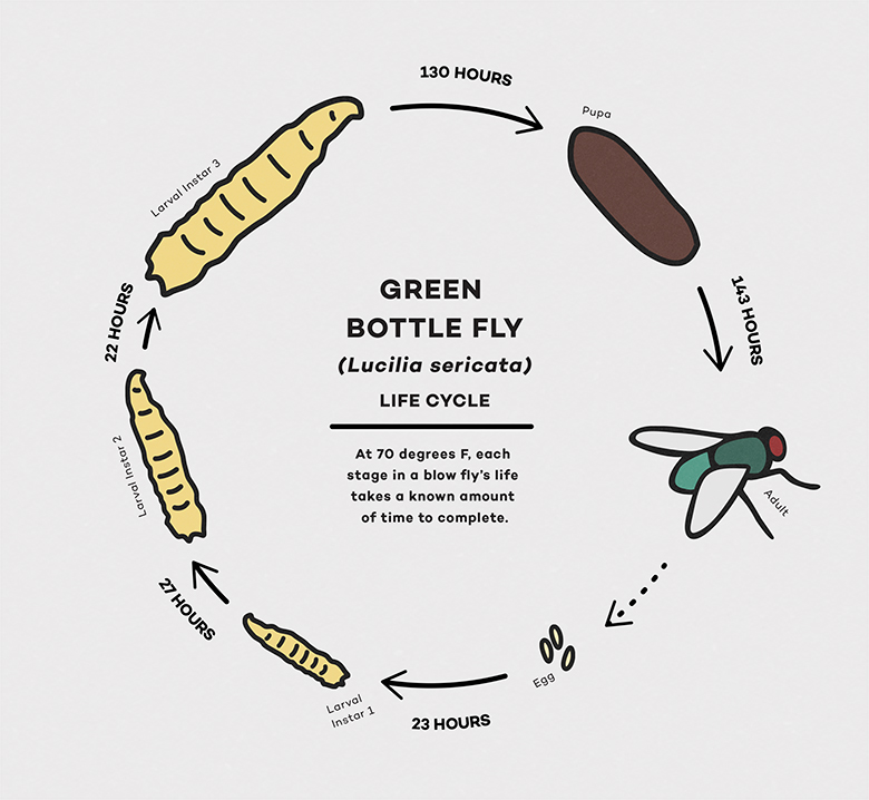 The green bottle fly is found in most tropical and temperate regions around the world, and it’s often one of the first insects to arrive at a corpse. Scientists have studied the life cycle of green bottle flies and have a good understanding of how environmental variables like temperature affect its rate of development.