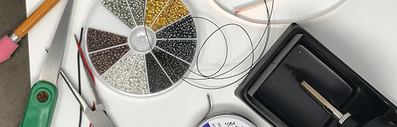 - Cut a short 4” piece of memory wire, crimp a wire crimp to each end of the memory wire and bend the wire back and forth to make it shorter. Set aside.