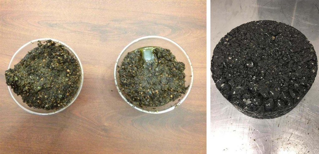 Did you notice that the material in the left image has similar coloring to the material in the right image? Olive pomace (material in the left image) was added to the paving material in the right image. Not quite what you would expect in paving material, right? Why would you add olives to road paving material?