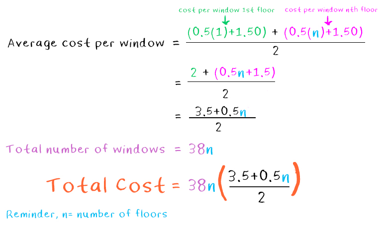 The cost of washing a single window grows linearly with each additional floor, which, as we learned before, can be expressed by 0.5n + 1.50. To calculate the average cost per window, we must calculate the average of the first and top floor windows: