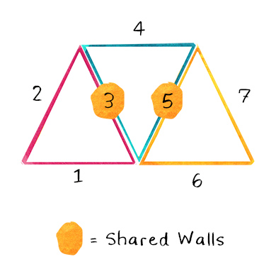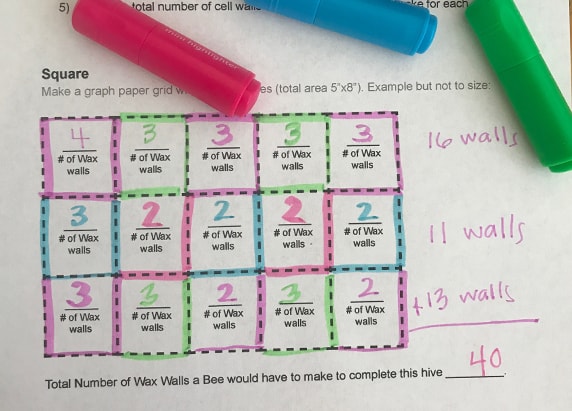 Let’s explore how well different shapes that share walls would work as honeycomb cells. Using different colored markers and the Sharing Cell Walls Worksheet, you will investigate which shape can be used to build a honeycomb with the greatest number of shared cell walls. Note that you’ll be covering an area with the same dimensions for each shape you investigate.