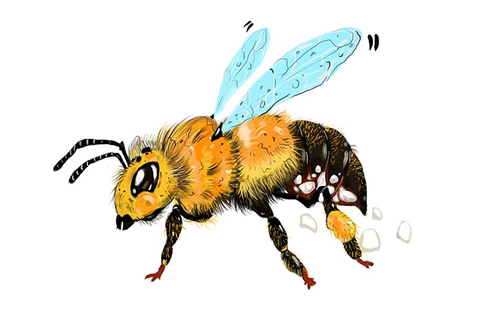 Bees collect nectar and pollen from flowers to make honey, a sugary food, for the colony. Honey provides bees with the energy they need to survive and reproduce, as well as to build their homes. In order to make enough wax, worker bees need a lot of energy, and must therefore consume a lot of honey. Some studies estimate that bees must consume eight ounces of honey for every ounce of wax they produce. Imagine how many flowers a bee must visit to be able to convert nectar into eight ounces of honey!