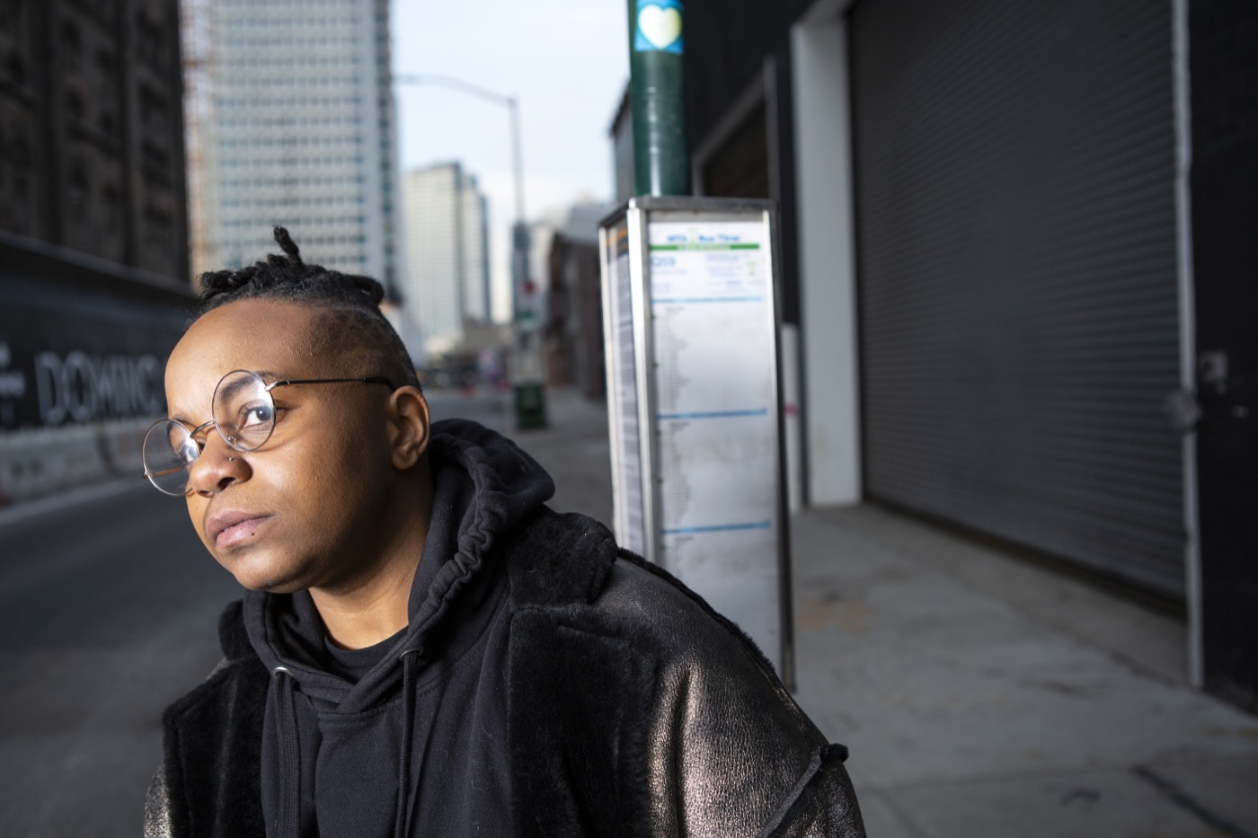 A transmasculine person waiting for the bus in a city close up