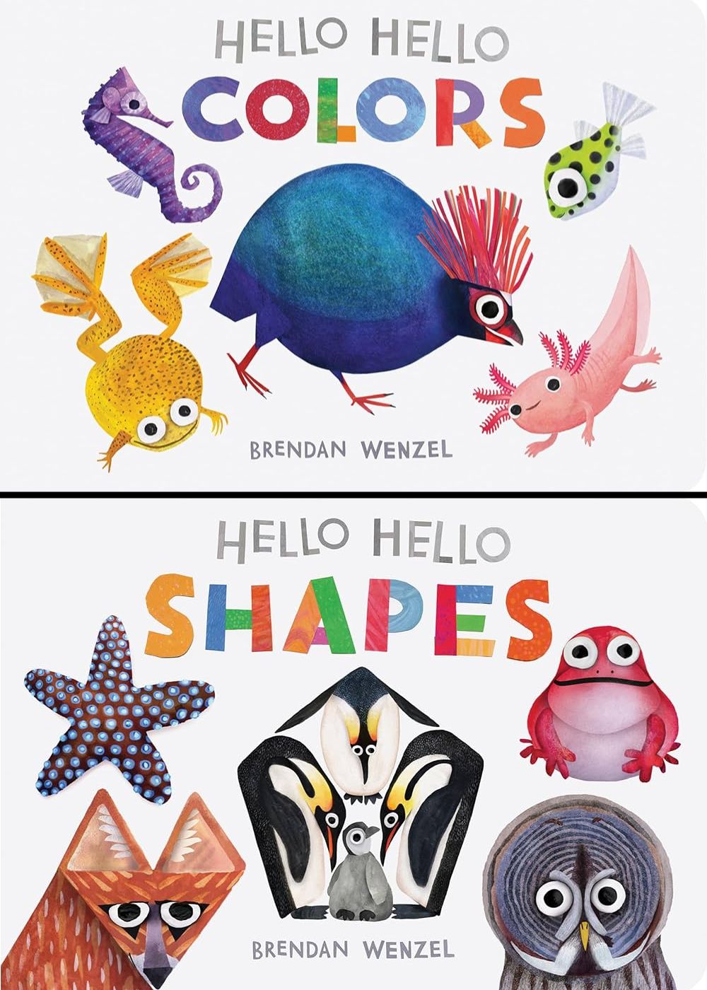 CARRIE WOLFSON: Yeah, one of my favorite new board-book series this year is from the Caldecott Honor winner Brendan Wenzel. He has a series of board books called Hello, Hello Colors, Hello, Hello Shapes, Numbers, and Opposites, and they all feature brilliant, colorful illustrations of real wildlife but also introduce those early concepts to young learners. So you’ll see everything from a sloth and a cheetah for your opposite books and then animals of all kinds of different shapes and sizes and speeds. So recommend that one.